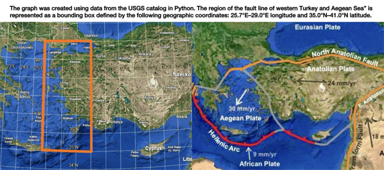 Fig. 5: Analyzed zone of the western Turkey–Aegean Sea fault line, sources: Google Earth, own modification (left), https://www.keeptalkinggreece.com/2020/01/25/turkey-earthquake-greece-lekkas/(device)