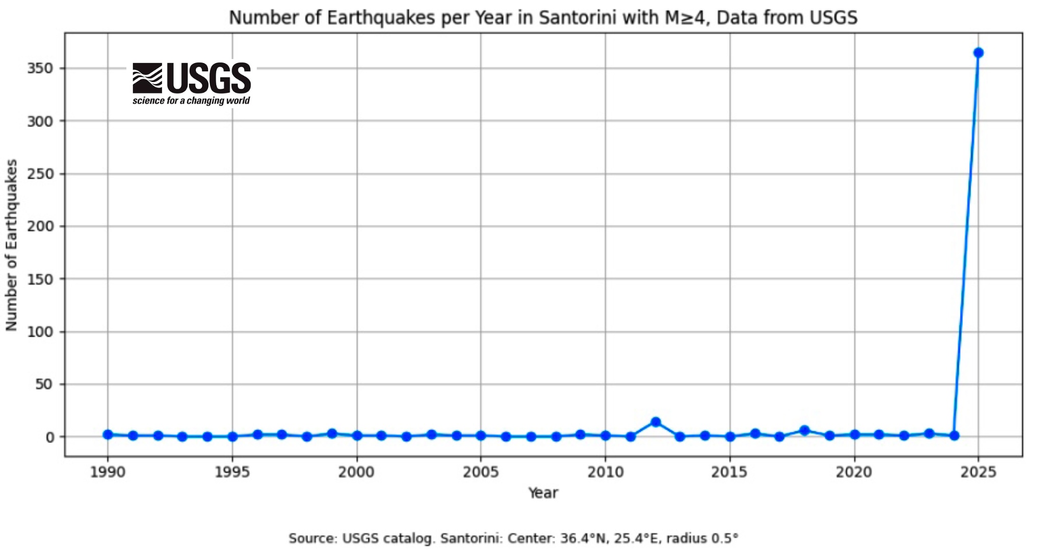 At the beginning of 2025, scientists recorded an unprecedented earthquake swarm in the Santorini area which, according to a study from the University of Oregon, was related to magma movement beneath the volcano8. While normally almost no earthquakes of magnitude 4 or higher occurred at Santorini, this year there were more than 350 according to the USGS database (Fig. 3).