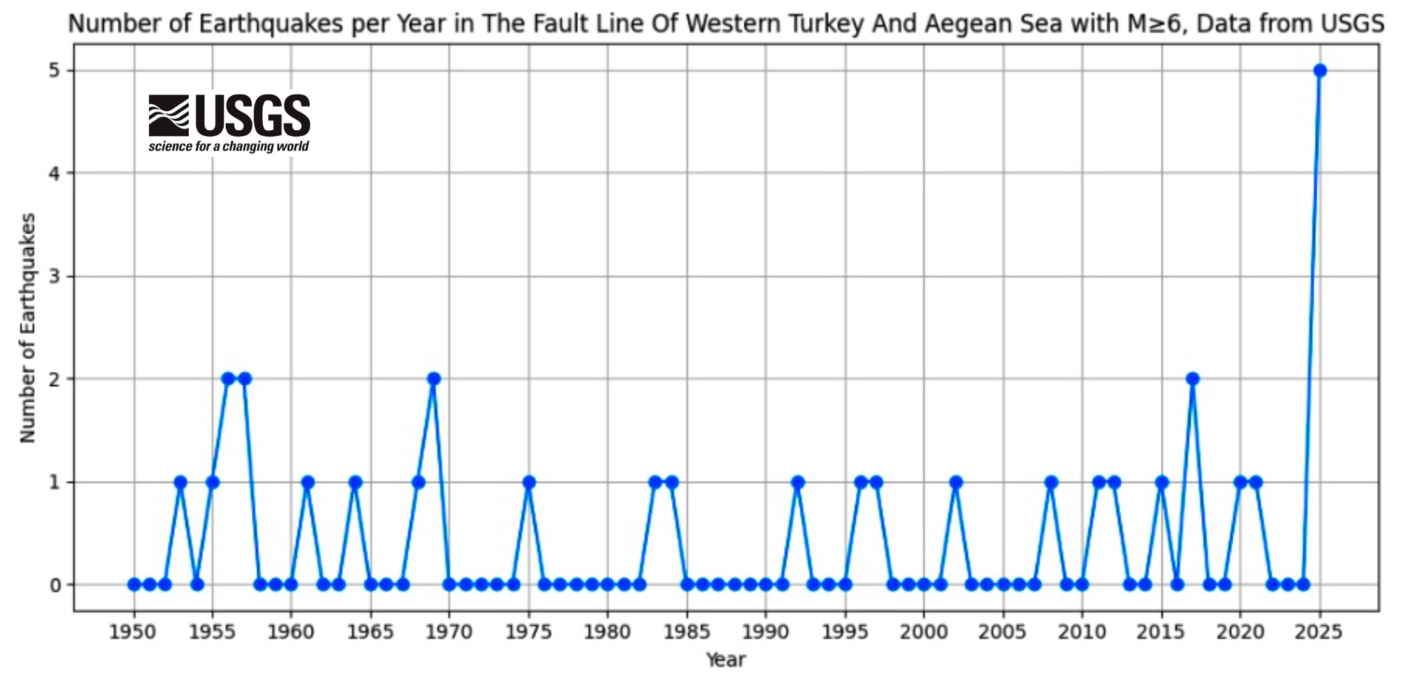 In 2025, five earthquakes with magnitudes above M 6 occurred in the region of western Turkey and the Aegean Sea, something that has not happened at least since 1950 (Fig. 4–5):