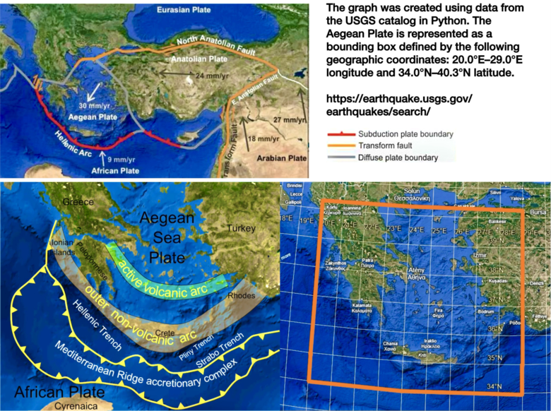 Fig. 2: Analyzed zone of the Aegean Plate, sources: https://www.keeptalkinggreece.com/2020/01/25/turkey-earthquake-greece-lekkas/ (top left), https://fr.wikipedia.org/wiki/Arc_%C3%A9g%C3%A9en#/media/Fichier%3AHellenic_arc.png (bottom left), Google Earth, custom edit (bottom right)