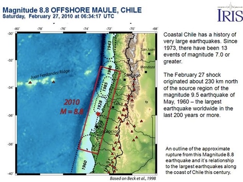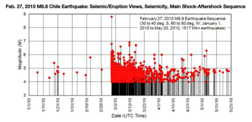 Fig. 6: Foreshocks and aftershocks of the 2010 Chile megathrust earthquake, source: https://web.ics.purdue.edu/~braile/edumod/chile/chile.htm