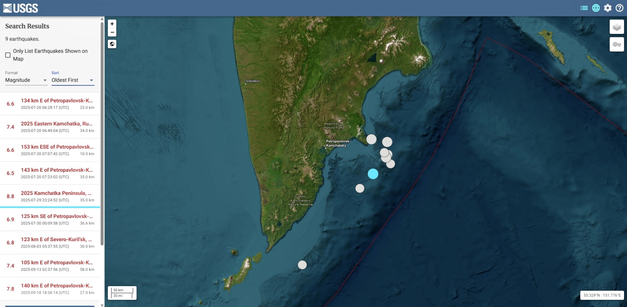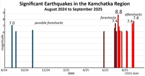 Fig. 8: Foreshocks and aftershocks with magnitude above 6 of the Kamchatka megathrust earthquake sequence 2024–2025, source: https://www.msn.com/en-us/public-safety-and-emergencies/natural-disasters/lori-dengler-a-very-large-aftershock-reminder-that-the-kamchatka-earthquake-sequence-is-not-over/ar-AA1MYowB