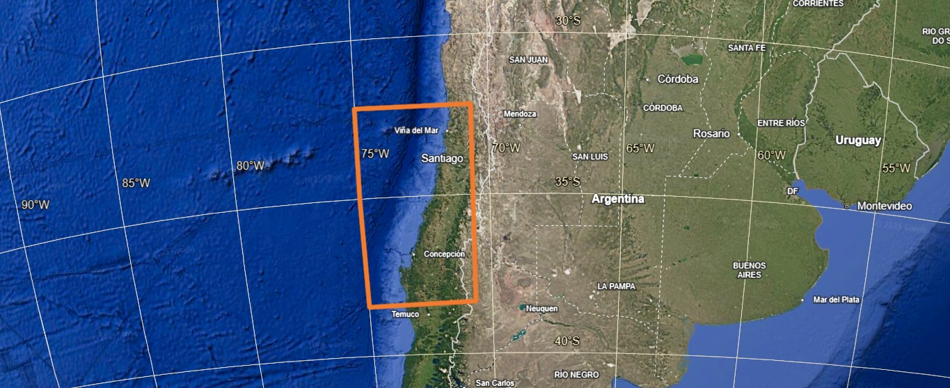 The west–east extent (75° W – 71° W) reaches from the oceanic portion of the fault zone to continental areas, enabling the capture of seismic activity located along the entire shear interface and within the overlying continental crust. The north–south extent (38.0° S – 32.5° S) corresponds to the length of the main rupture zone of the megathrust earthquake and includes areas with the highest density of aftershocks.
