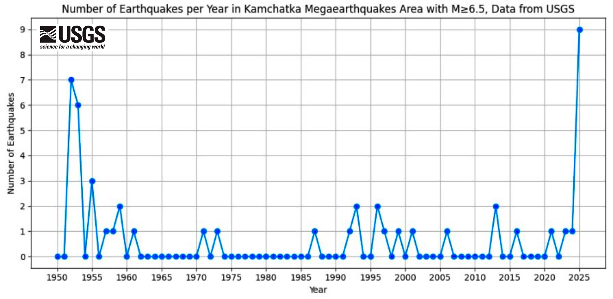 The November 4, 1952 megathrust earthquake had 7 aftershocks of magnitude M ≥ 6.5 in the first five months after the event (November 4, 1952 – April 4, 1953). A similar but even more pronounced increase in activity is observed in 2025 following the M 8.8 megathrust earthquake, which represents the highest annual frequency of strong foreshocks and aftershocks within the entire analyzed time interval.