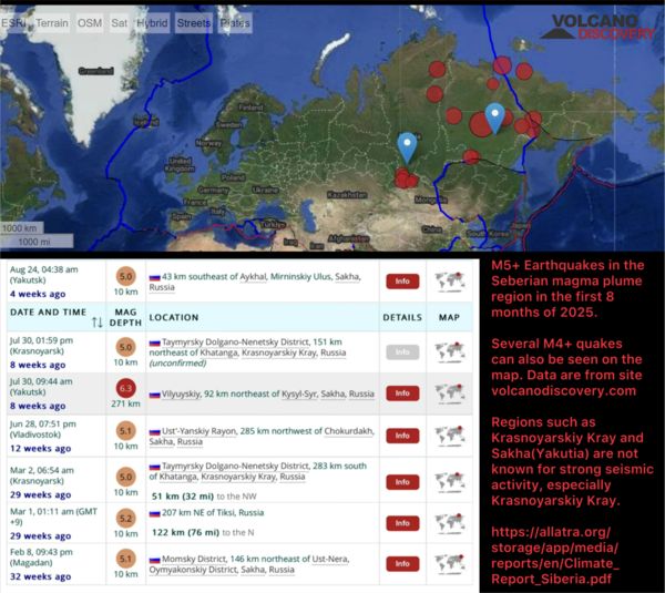 Fig. 11: Earthquakes with magnitude greater than M 5 in the Krasnoyarsk region and Yakutia during the first eight months of 2025. Sources: https://www.volcanodiscovery.com/earthquakes/russia/sakha/archive/2025.html, https://www.volcanodiscovery.com/earthquakes/russia/krasnoyarskiy-kray/archive/2025.html