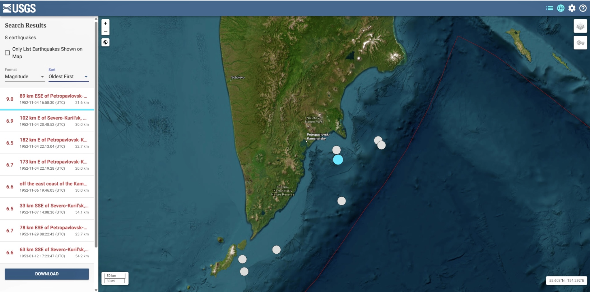 Fig. 4: List of earthquakes and their locations with magnitude greater than M 6.5 in the aftershock zone of the 1952 megathrust earthquake and the first three months of 1953 (USGS): https://earthquake.usgs.gov/earthquakes/search/