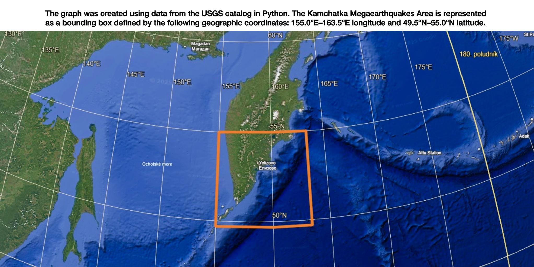 The analytical spatial window was defined as 155.0° E – 163.5° E, 49.5° N – 55.0° N, with the aim of capturing the direct aftershocks associated with the megathrust ruptures of the Kamchatka 1952 (M 9.0) and 2025 (M 8.8) earthquakes while maintaining maximum comparability between the two events.